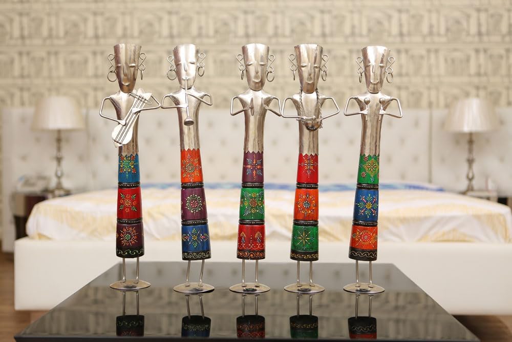 The set of five tribal figures is a perfect decorative item for any living area. They represent musicians playing traditional musical instruments, which create a sense of happiness and gaiety wherever they are placed. The traditional attire and the brilliant colors add to the beauty of the set.